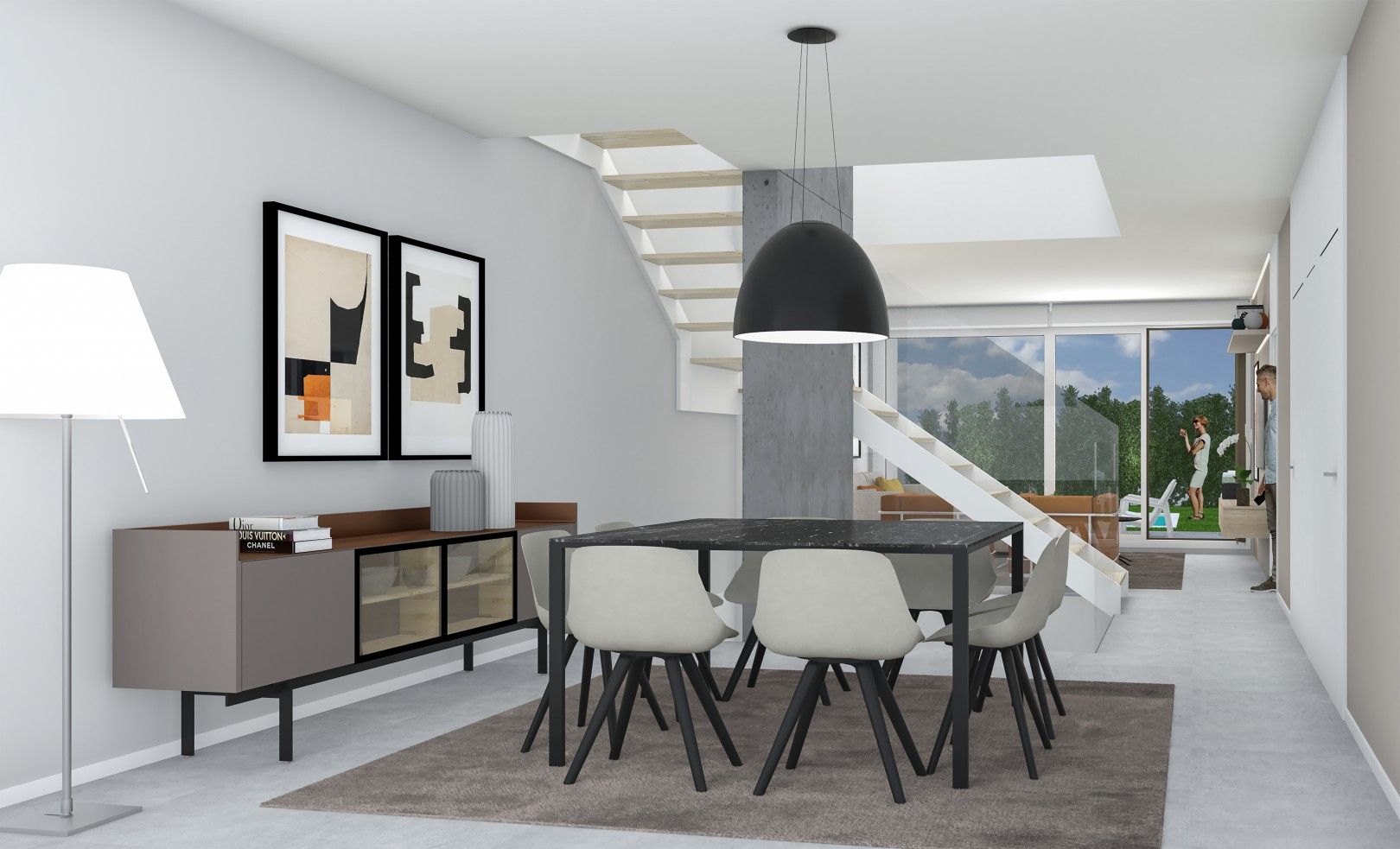 La planta baja incluye también un dormitorio doble y un baño completo, aportando versatilidad y comodidad a la vivienda. La escalera principal se ha diseñado con la posibilidad de instalar un ascensor, adaptándose a las necesidades de cada familia, hoy y en el futuro.
