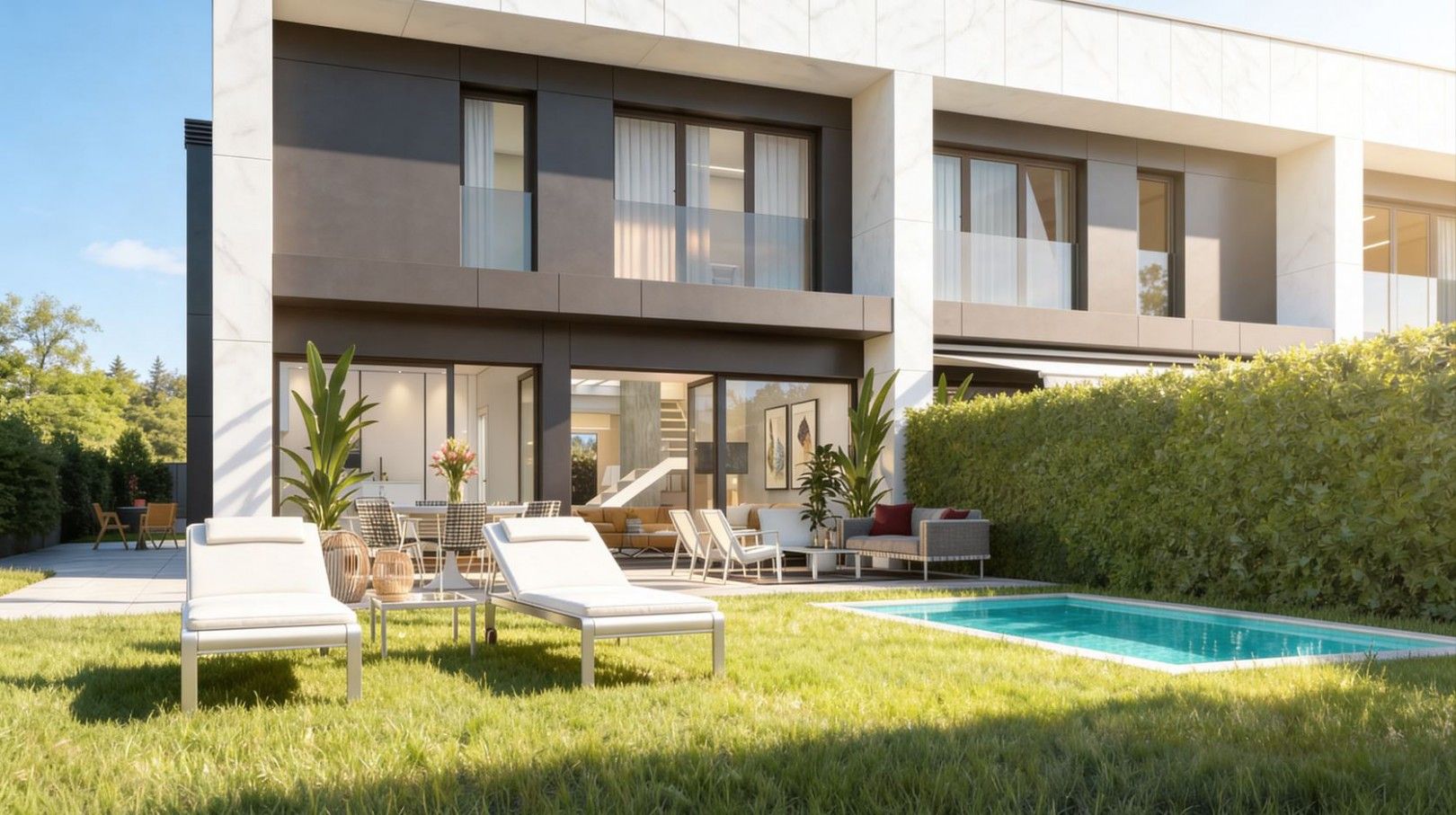 Cada vivienda ha sido cuidadosamente diseñada para ofrecer máximo confort, luminosidad y funcionalidad, con una arquitectura contemporánea que combina elegancia y eficiencia. Se distribuyen en dos plantas, con amplios espacios abiertos y grandes ventanales que inundan las estancias de luz natural, integrando el interior con el jardín privado.
