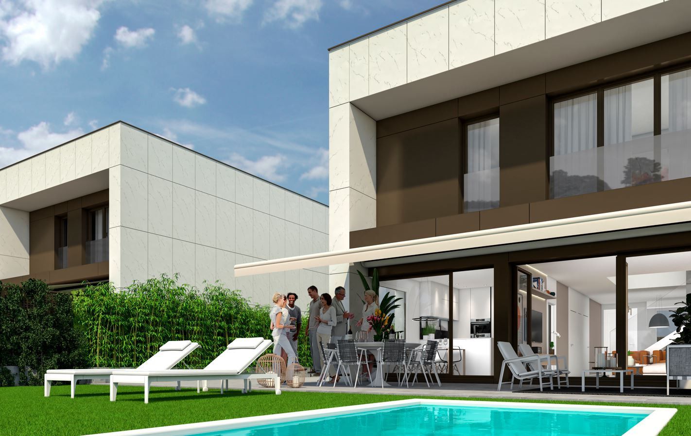 Cada vivienda ha sido cuidadosamente diseñada para ofrecer máximo confort, luminosidad y funcionalidad, con una arquitectura contemporánea que combina elegancia y eficiencia. Se distribuyen en dos plantas, con amplios espacios abiertos y grandes ventanales que inundan las estancias de luz natural, integrando el interior con el jardín privado.