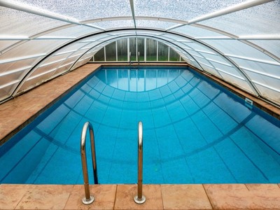 En el exterior, la propiedad se asienta sobre una parcela de 725 m² que ofrece un auténtico espacio de recreo: una piscina cubierta, una piscina infantil y vestuarios, todo ello rodeado de un entorno privado que garantiza tranquilidad y disfrute durante todo el año.