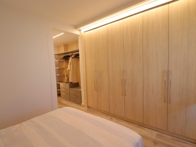 En la primera planta, se encuentra un espacioso dormitorio, que destaca por sus armarios empotrados y un vestidor incorporado, proporcionando un generoso espacio de almacenamiento. El baño de esta planta es moderno y completamente equipado con una ducha.